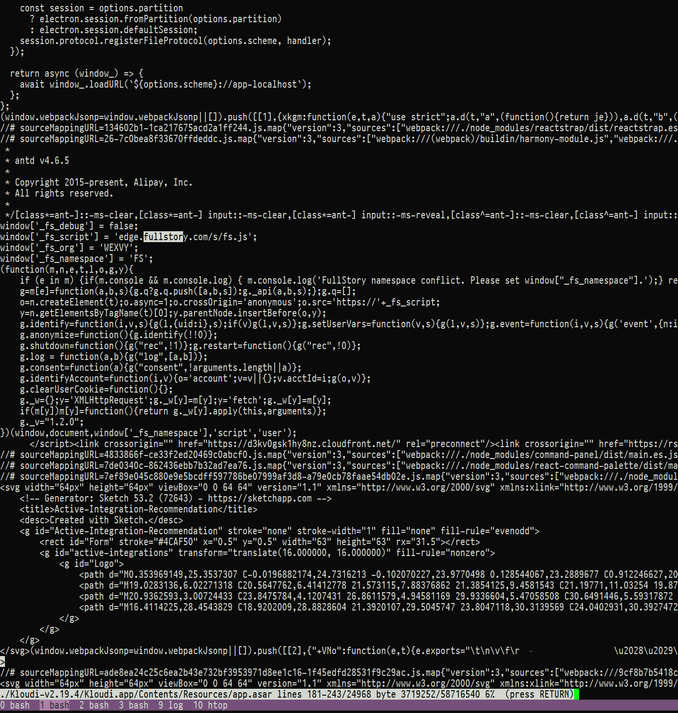 Kloudi uses FullStory in its Electron GUI too! https://justine.lol/kloudi.png If anyone's wondering, FullStory is basically a keylogger that gives you the godlike ability to spy on your users in real time. https://www.fullstory.com/blog/want-to-co-browse-with-your-c... We live in a creepy orwellian world. It amuses me that the authors of this "command line" thought they could fool Hacker News.